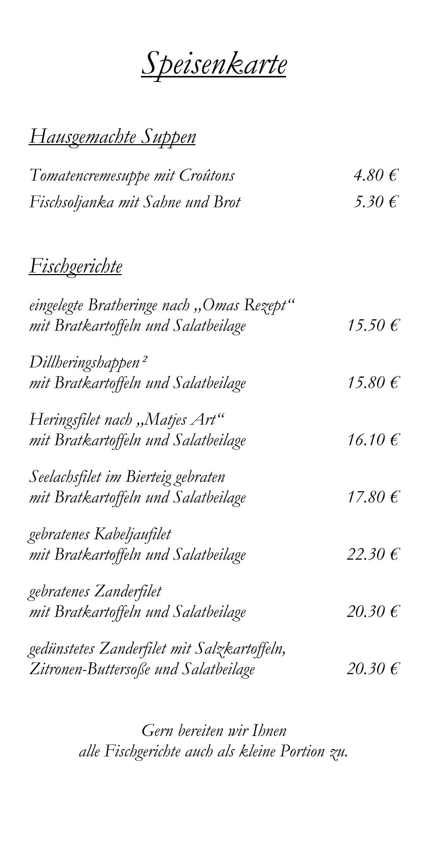 Kulinarisches Angebot Fisch der SaisonDrei gebratene Heringe mit Bratkartoffeln und Salatbeilage 15,50 € Tripadvisor Google Yelp
